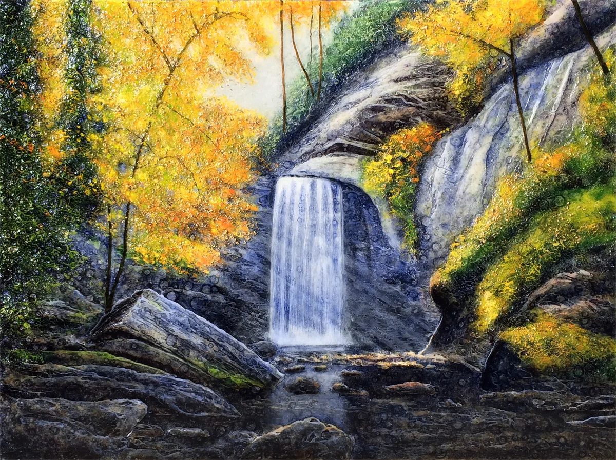 I'm about ready now to apply aluminum leaf to my largest painting to date: Cullasaja Falls, and it occurred to me it would be a really good idea to practice on another waterfall so that I get this down. I don't want to "experiment" on this big one (it's just too large a statement piece to practice on and maybe mess up). So I chose one of my favorite waterfalls around here (about 45 minutes from my studio) and definitely one of the local landmarks. So I experimented on a much safer size (18" x 24") and I am REALLY happy with the way this one turned out and yep...I feel ready to tackle the big one now.