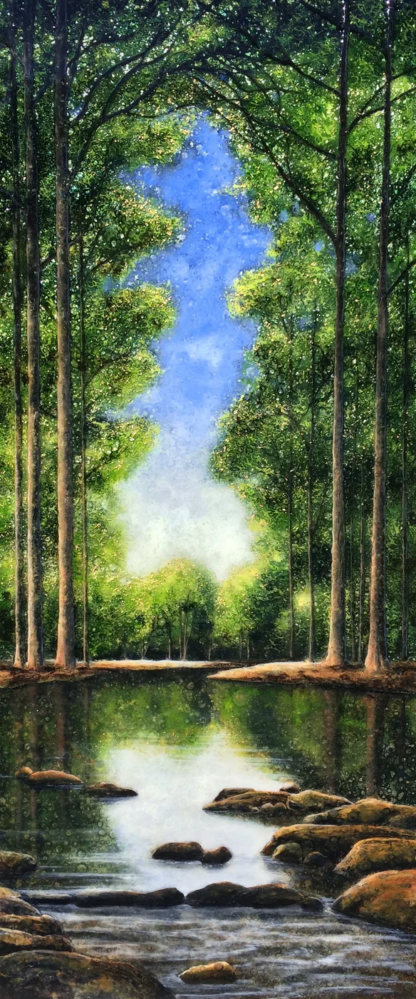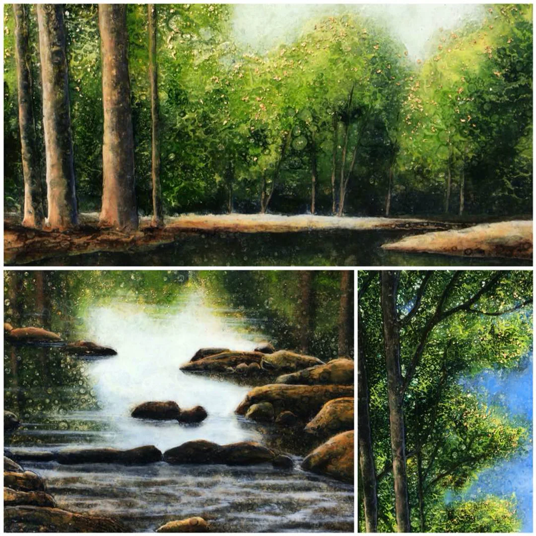 Living here in the land of rivers and waterfalls, we've fallen in love with exploring random and sometimes seldom used trails around the mountains of western North Carolina. The silence except for the rustling of leaves and the gentle gurgling of a stream -- the feel of cold clear water on your feet after a long hike -- that's what I love about living here. One such hike inspired this painting. I've entitled in "The Journey" because a river is not just an entity in itself and it's not a singular creation...it is the joining of many waters into one river that may not have a recognizable beginning, but all the energy gathered from all the sources cascades over obstacles, growing wider and more powerful along the way to it's eventual union with the sea. That's life.