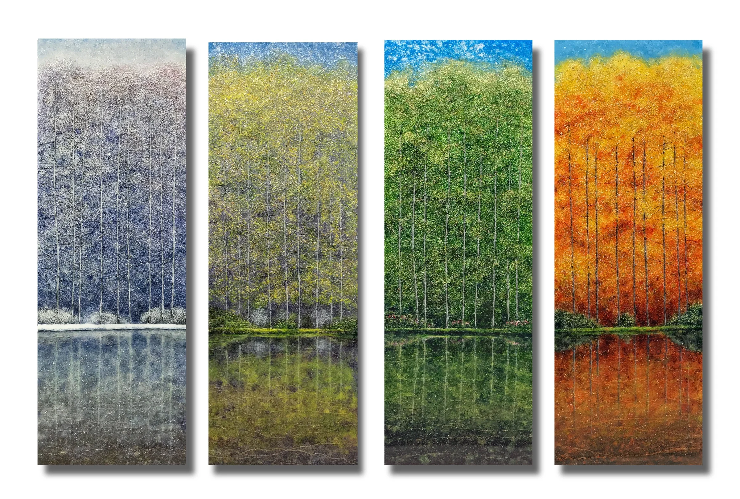 The beauty of seasonal change is a big part of what I love about living in Asheville and working in my art studio. So I was really excited to have been asked by Mission Hospital to create a “Four Seasons” series for their Asheville campus. Each panel is 42” x 16” and each are covered with multiple layers of solar-resistant resin (so the surface is glassy-smooth).