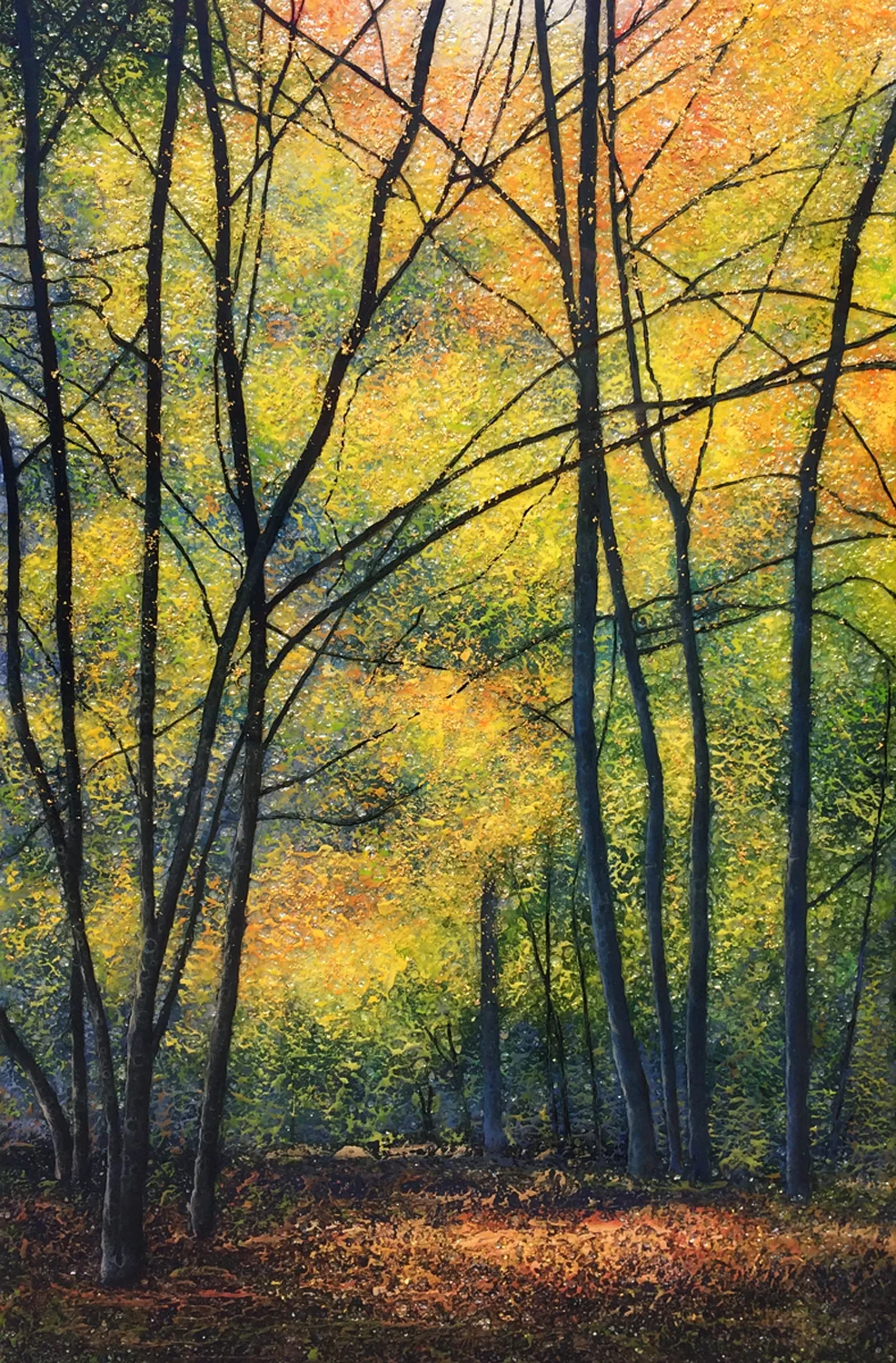 Living in Asheville, North Carolina as an artist in the River Arts District, I don't see many birch trees in the woods around here. Western North Carolina has river birches and they're nice and all, but we do not have proper "paper birch" trees. Thankfully, I don't have to just paint local scenes (though I do end up celebrating the mountains and trees of the Blue Ridge and Appalachian Mountains more than anything else). This painting, "Forest of Autumn Gold" is based on my memories of a certain October thirty four years ago when Joy and I visited the state of Maine on our honeymoon. Birch trees (proper paper birch!!) were everywhere. I remember the sound of the leaves in the wind roared like a waterfall. So beautiful.