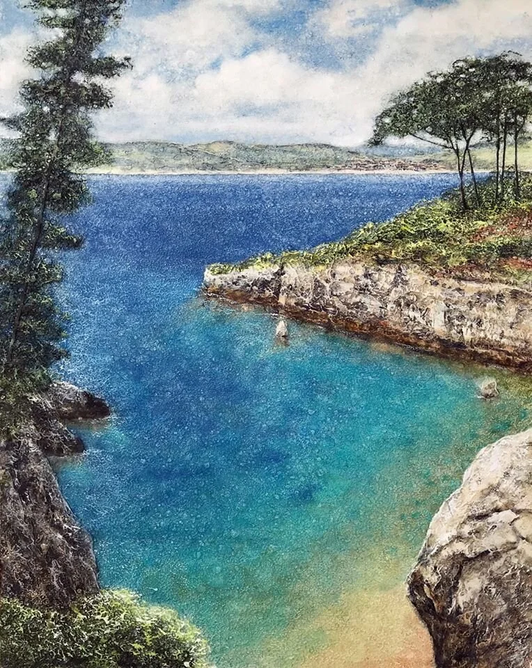So instead of a crowded beach day, we settled on a walking day. And what I randomly found on Google maps turned out to be one of the highlights of our whole visit to France. There is a peninsula just east of Nice called Saint-Jean-Cap-Ferrat and there is a footpath around nearly the whole peninsula. This little footpath seemed to be entirely unknown by tourists since we were about the only people on it, and here and there, there were tiny little inlets and beaches (completely empty beaches). This painting is based on the photo I took of the exact spot we stopped to have our lunch and where we spent time swimming in the most amazingly clear, radiant blue water I've ever seen.