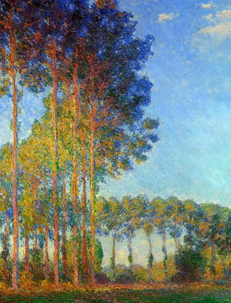 Look at the above painting of the poplars. Have you ever seen blue trees? No, but it works here in this painting. The blue shadows he uses accentuate the warm red and orange and gold used to illustrate the sunlight. And that really is the color formula he teaches us -- warm colors and their complimentary cool color right up against each other simulates the play of light and shadow in the real world.