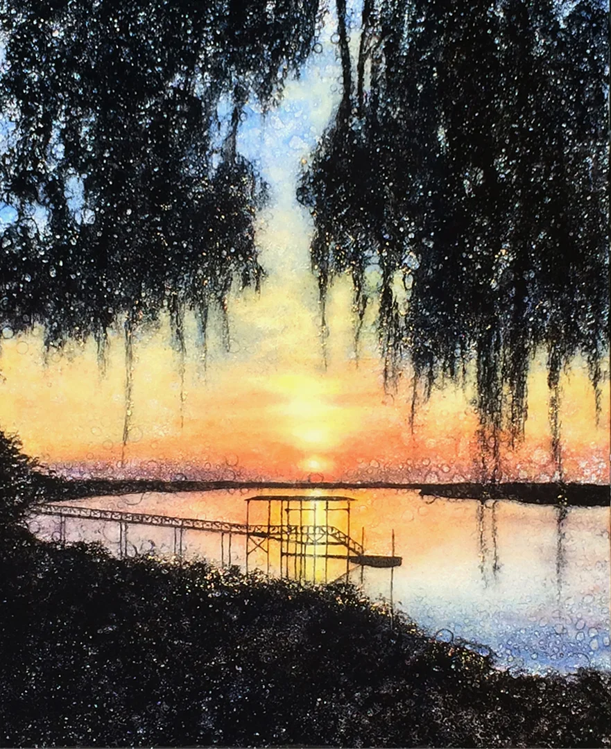 Recently, some visitors to my Asheville art studio commissioned a couple of paintings from me, one of which featured a sunrise over Driftwood Beach on Jekyll Island (just off the coast of Georgia) and the other is sunset through Spanish moss hanging on oak trees in Florida. I think probably no matter where you are in the world, this time of day is the best, but the intensity of the colors and the length of the shadows are awesomely amplified when the sun is rising or setting over a body of water.