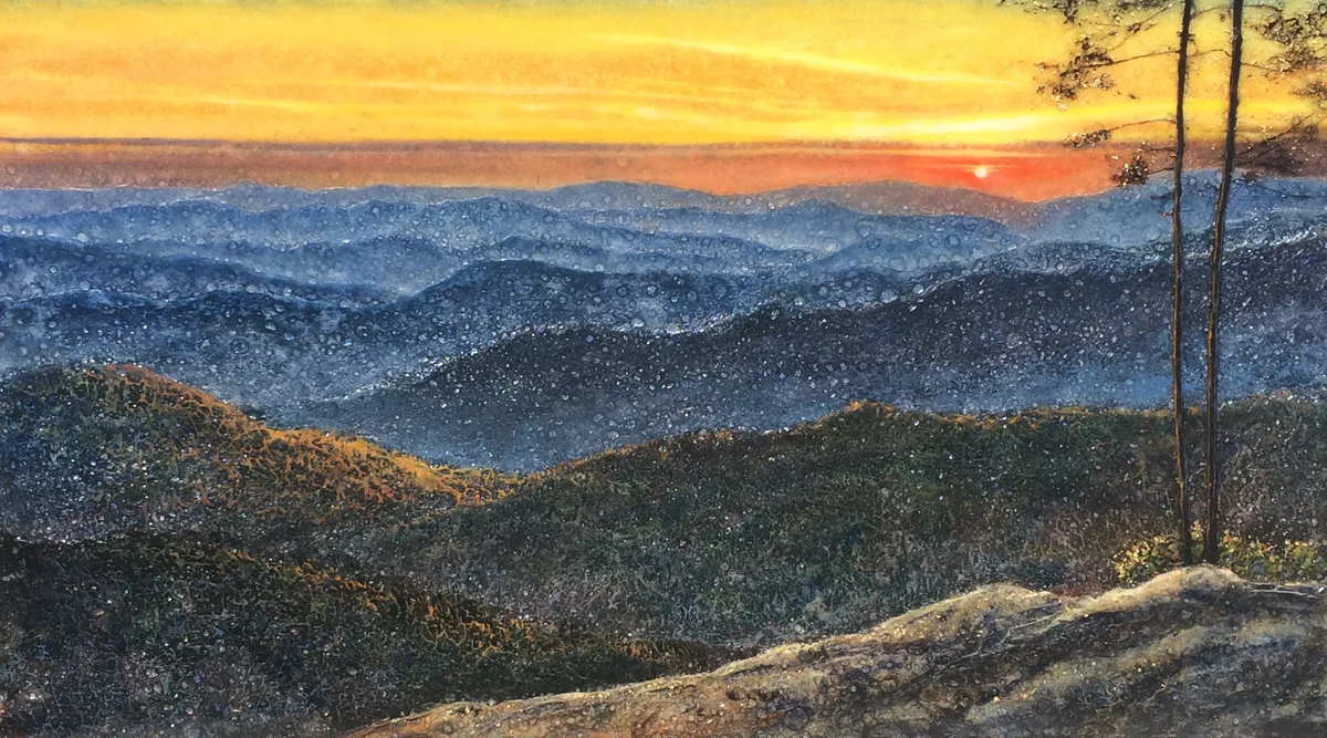 Here is my next "Sunset" themed piece. Someone last week asked "Is that sunset or sunrise"? Good question since this is just a scene out of my head but to me, this looks restful, not "waking". Now the crickets begin to chirp and cicadas begin their song, unceasing through the night. Someday, I'll paint a good sunrise but for now, this one to me is definitely and happily a sunset over the Blue Ridge mountains. Take a drive on the Blue Ridge parkway in either direction from Asheville at about 8:00 tonight and this is what you'll most likely see (and this is why I love living in Western North Carolina.
