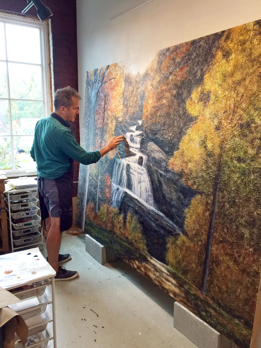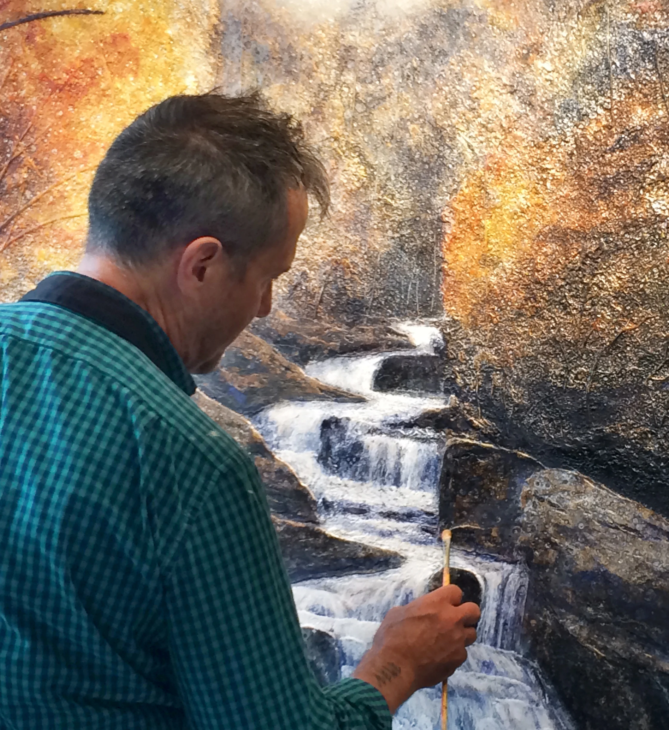 A. About 17 years ago, I was at an outdoor street art festival in Mt. Dora, FL. At that event, there was an artist that had a booth filled with Greek Orthodox icons. These were legit. He was painting with hand-ground pigments and traditional gel mediums. They were amazing. I had never, ever seen the color of paint do what it was doing on top of 24c gold. It was incredibly rich and intense. After about an hour in the booth, I went home with an idea. I had to try painting on top of gold leaf (I had a couple scraps around) using the medium I was familiar with (oil paint) to see if it could possibly work. And it did. And then I realized I did not need gold to achieve the effect I wanted. Gold works because it is reflective. After a good deal of hunting around for a metallic leaf that would work, I found Italian aluminum leaf (the most pure aluminum leaf there is). That is what I paint on. And I do that because it reflects light back through my paint, creating a "backlit" oil painting. And I do that because when you back-light pigment (as in a stained glass window), you greatly intensify the color.