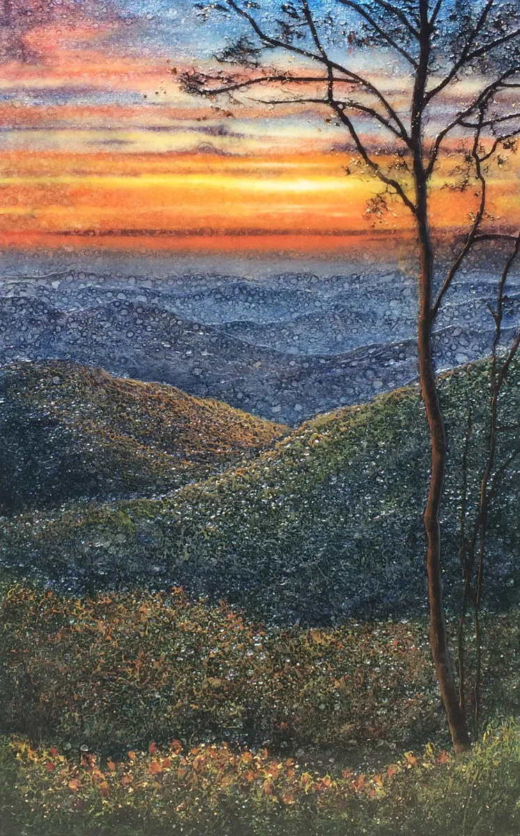 Here is my next "Sunset" themed piece. Someone last week asked "Is that sunset or sunrise"? Good question since this is just a scene out of my head but to me, this looks restful, not "waking". Now the crickets begin to chirp and cicadas begin their song, unceasing through the night. Someday, I'll paint a good sunrise but for now, this one to me is definitely and happily a sunset over the Blue Ridge mountains. Take a drive on the Blue Ridge parkway in either direction from Asheville at about 8:00 tonight and this is what you'll most likely see (and this is why I love living in Western North Carolina.