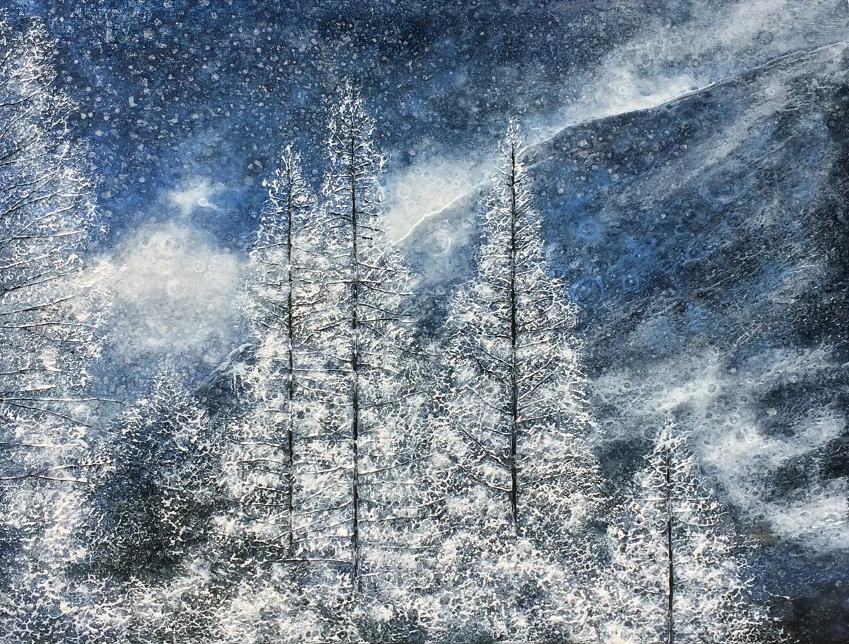 I have no idea why my second point is true. I would have thought a winter themed painting would be a "slow mover" when it comes to sales but my winter paintings are still selling in the summer so...being the keen entrepreneur that I am, I will continue to paint winter themes as longs as they sell. This painting in particular gives me great joy. It is called "Top of the Mountain" and features a stand of balsam trees heavily laden will snow. And as in most winter paintings, it is almost monochromatic. I think reducing a composition to nearly black and white (as you do in a winter scene) is really challenging and if pulled off right (hopefully!) is really dramatic.