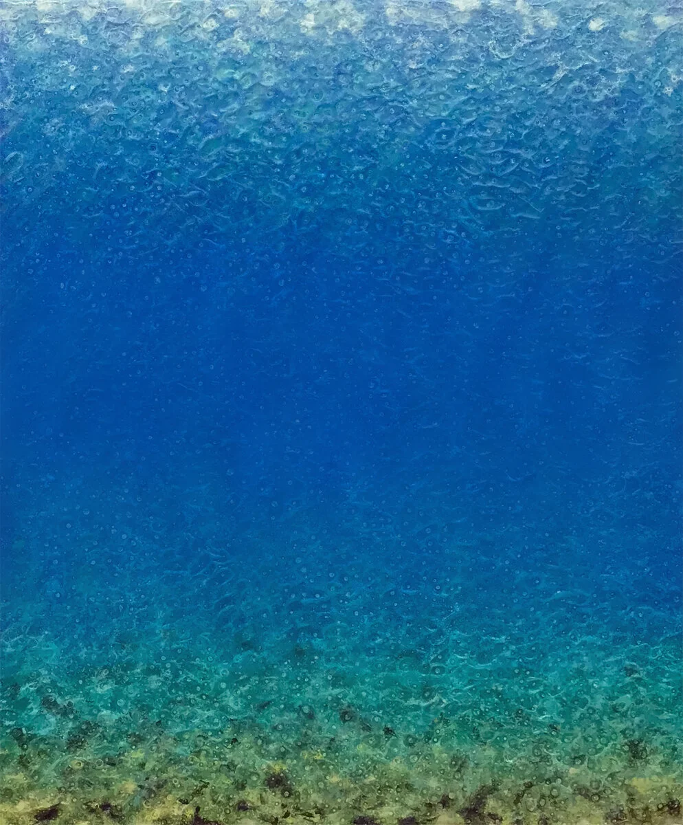 One of the days, I found what looked like a foot trail around a peninsula just east of Nice, France (where we were staying). There were no write-ups about it but on Google maps, you can zoom down and explore on “street view” to see what it looks like “on the ground”. It looked like a great place to spend the day on a six mile walk, so that’s what we did. What we discovered though was blue heaven. It was amazing. We found a little beach where we had our picnic lunch (all by ourselves) and then later, a little pebble beach for our first swim in the Mediterranean, again, completely alone. What I saw once diving down was unbelievable to me: the blue. I’d never seen water look like that. Never. I thought I knew what ocean water looks like…kind of a grey green color. But this was absolutely crystal clear, and when you dove down and looked out into the deeper water, I was met with the most intense blue I’d ever seen. The thought struck me “I HAVE TO PAINT THIS!” so I began diving down…over and over and over (probably 30 times or more), just trying to permanently engrave the colors into my head. And then, as soon as we got back state side, I began painting.