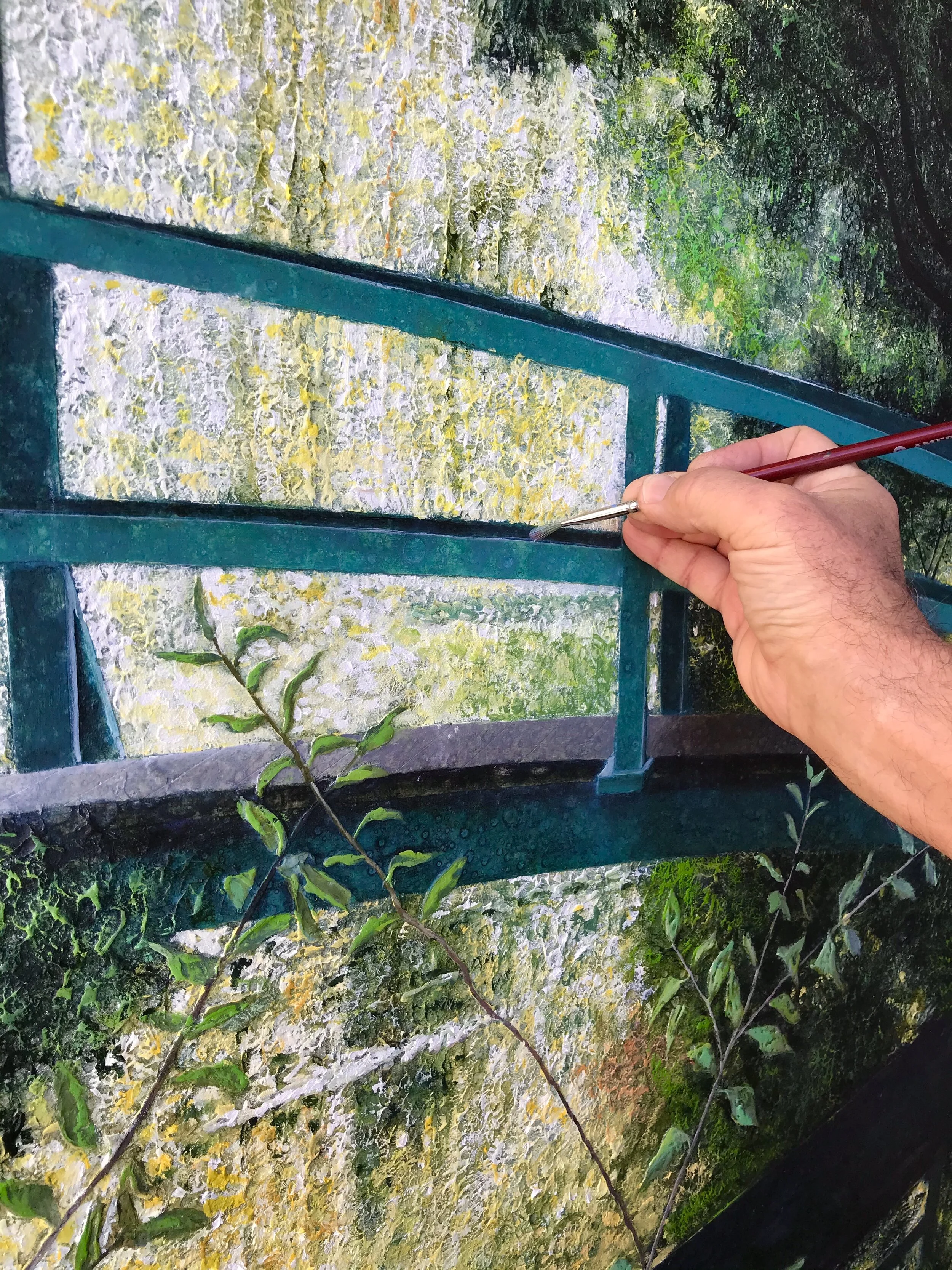 But every now and then, I make an exception to this rule. On New Years day as I was sitting in my studio mulling over life, a voice in my head seemed to whisper “make more exceptions to your rule this year”. Well, who am I to silence that little voice? So the afternoon of January 1, I prepped my canvas and pulled out one of my favorite photos I took in France. The photo is of what is probably the most famous Japanese bridge in the world: Monet’s bridge in his lily pond in Giverny (just northwest of Paris). I have spent more time applying the texture than I ever take. But for these “exception” paintings, time will not matter. This piece (pictured here) is now ready for the Italian aluminum leaf to be applied, followed by countless layers of oil paint.