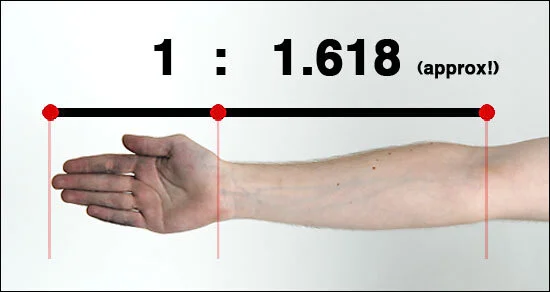 If you take the average distance from your shoulder to you fingertips and divide your arm into two sections (using the golden section), you locate your elbow. Divide the distance between your elbow and your fingertips (using the golden section) and you locate your wrist. Keep dividing and you locate each knuckle all the way to the end.