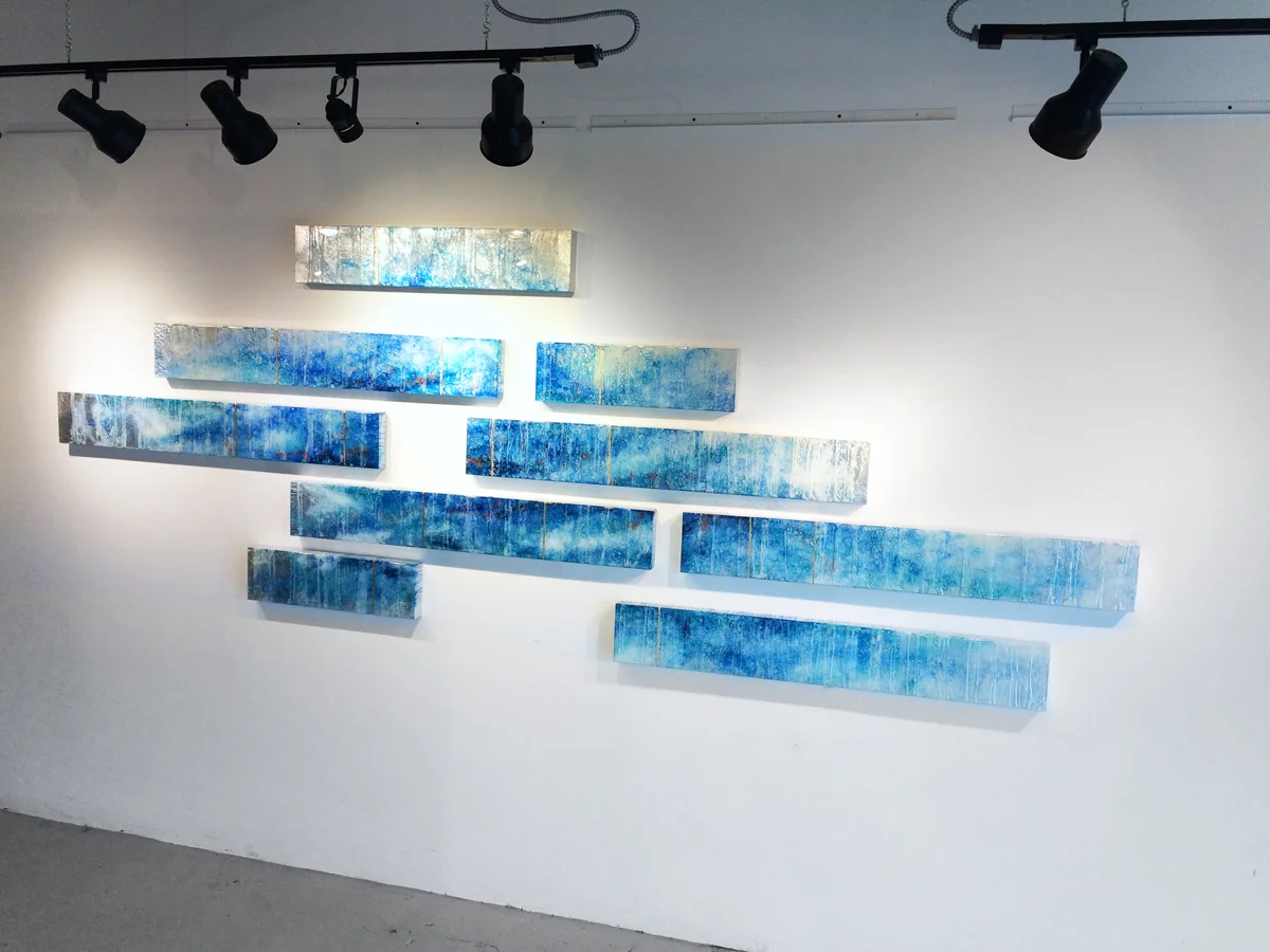 This piece was an unexpected challenge. Ha! I have found that the term “unexpected” is usually applied to all my abstract paintings because they seem to have a mind of their own. I tell visitors to my art studio that painting an abstract painting is a bit like raising a teenager: they have their own mind and don’t like to be forced to conform to YOUR will. They have their own plan. It sounds almost metaphysical (sorry) but my job as a painter is to figure out what each abstract paintings “wants” to become. Landscape paintings are totally different. They’re like the super agreeable and responsible first born kid. An abstract piece is, uh….not like that. This particular abstract installation was a particularly challenging painting, in that I painted it twice. I originally had my own idea regarding what I wanted it to look like. So I spent several weeks applying paint and not liking it. So I worked on it more and arm wrestled it into compliance…and..then…