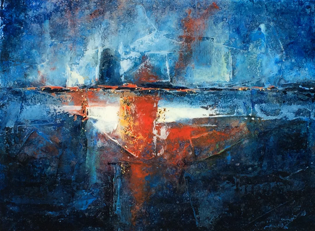 This abstract oil painting is one of those "fire & ice" color combos with flex of gold leaf embedded in the resin coating, floating just above the surface of the artwork.