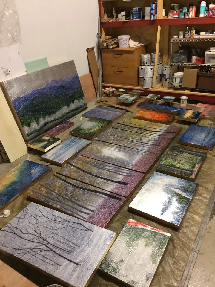 This photo shows what a slob I am. "Santa's Workshop" has never been busier, with 21 oil paintings currently underway (that's more than I ever have worked on at one time). I'm SO THANKFUL! I'm working right now on several commission pieces and a dozen new landscape and abstract paintings for my Asheville studio wall. Okay, enough social media...back to work. —
