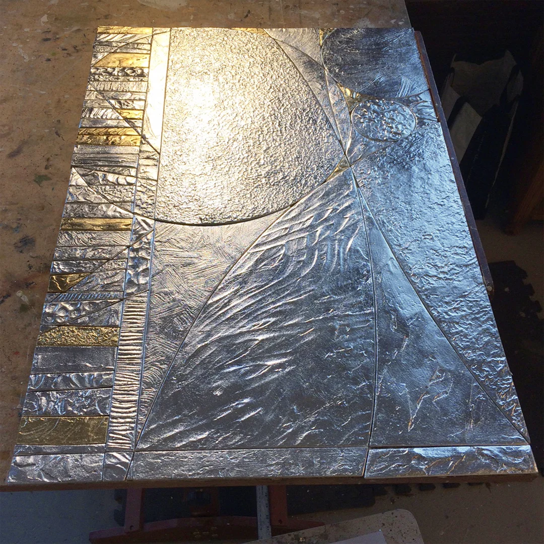 This painting has a way to go before completion, but I love the process: texture, aluminum leaf, paint and finish. More to come on this one...