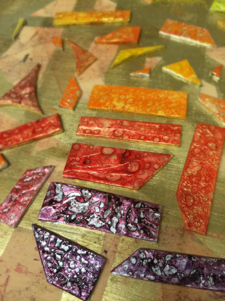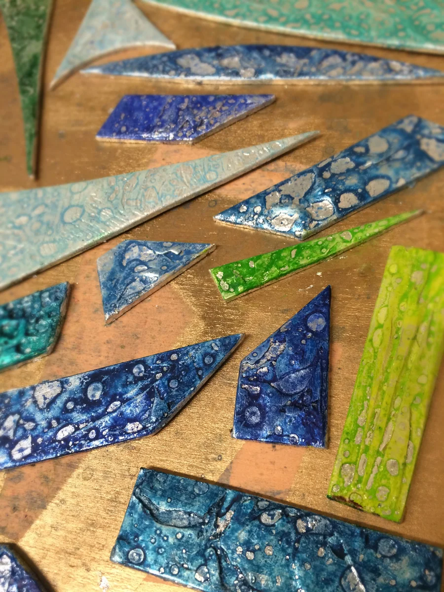 This is the beginnings of a new "intarsia" piece I'm working on. Each piece (there are 76 of them) is cut out, texturized, painted and then assembled and resined. The photo above shows the first actual assembly of the piece before the first layer of paint was applied. Photos below are just a couple to show what they look like with the first layer of paint. They will get several more layers of paint...so stay tuned.