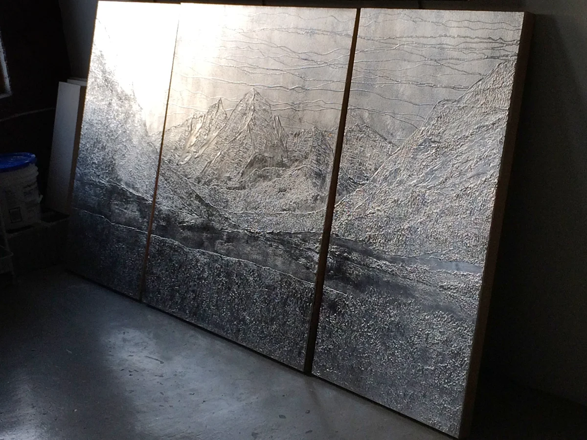 I love working large. Large artwork is commanding. Whether it’s intended as entrance art to grab you as soon as you enter a house or just a large wall piece, a sizable painting is artwork on a grand scale. I am currently working on a large commissioned art project for some nice folks in Austin, TX. The composition is triptych, and is based on a scene of the Rocky mountains -- mountains and birch trees reflecting in a lake. I just finished applying the metallic leaf to the textured surfaces of the panels yesterday and I was ready to go home -- turned off the lights and went to the back of the studio to get my keys, and when I turned around, I saw the panels reflecting back the late afternoon sunlight and I had to get a photo. Sorry. I get excited about stuff like this. One day, I'll have to just do a painting with no paint at all -- just metal covered with resin. I think that would be cool. Anyway, this one is ready for paint now, and by the end of the day, I'll have that first layer of paint applied.